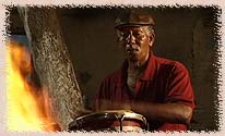 L’homme était pour ainsi dire impénétrable. De lui, nous ne saurons que peu de choses. Sa vie de célibataire dans une petite bicoque en bas de la ville mauve. Les animations quotidiennes dans un des seuls bars de Trinidad. Sa réputation de grand percussionniste solitaire et rebelle. Il aurait toujours refusé les propositions d’engagements à La Havane, de tournées à l’étranger, de disques. Tout cela ne l’intéressait pas. Sa timidité maladive et sa maladresse n’avaient d’égales que sa maîtrise aux tambours et la subtilité magique de son jeu. Le grand percussionniste Tata Güines considère Alberto comme un maître et, certes, l’homme est sans doute un des meilleurs sonneurs mystiques de l’île. Mais c’est un campagnard fruste, austère comme les paysans des montagnes desséchées, religieux et marqué par la Santeria qui règle la vie dans ces terres anciennes. Chez lui, le sacré l’emporte sur toute ambition et l’esprit du tambour s’enracine loin dans la terre rouge d’Afrique. Lors du tournage à Trinidad, il était là chaque soir, dans la grande cour ou sous la tonnelle aux cannettes rouillées. Ses amis musiciens le rejoignaient pour des petits concerts entre copains. Sans public, autour d’une bouteille de rhum qui tournait de main en main, il reprenait souvent les vieux airs du feeling à la mode dans les années 70. Gallo fut vite intégré à la compagnie des buveurs silencieux. Tout était très lent et très calme. A la tombée du soir, Alberto Pablo, comme un génie lunaire, imposait naturellement cette tranquillité et cette assurance sans limite.