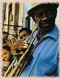 Les premières phrases que nous avons échangées avec Pepin Vaillant – le trompettiste le plus excentrique, le plus givré du pays – étaient en français qu’il parle avec un accent qui mélange américain et espagnol. Pepin a vite évoqué Paris, la vie nocturne à Pigalle dans ces années 40 et 50. Pepin a gardé la dégaine, les yeux vifs et ronds et, surtout, cette distinction du langage des années 50. Nous avions notre homme et, avant de le quitter, nous lui avons proposé une séance de photo improvisée dans la rue. Et là, devant le mur délabré d’une maison santiaguera, le vieil artiste a pris la pose en rigolant, tenant sa trompette d’une main et lançant sa longue jambe au-dessus de sa tête, comme jadis dans une posture grotesque, acrobatique et tellement insolite dans cette ruelle que les passants ne tardèrent pas à s’attrouper autour de nous.
